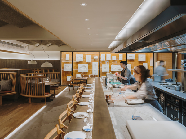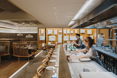 Behind this cutting-edge culinary project is chef Nandu Jubany, who worked in collaboration with Lagranja Design and reMM Lighting Design studios on the design of the space. “The concept comes from long conversations with Nandu” –says Gabriele Schiavon, founding partner of Lagranja together with Gerard Sanmartí– “he sought to create a space where the kitchen was at the centre, and we took the idea a step further.” Nandu wanted to introduce diners into the gastronomic process, so they would be part of the performance and enjoy the show. From the curved wooden seating around the kitchen, diners closely follow each moment of the preparation of their dishes, just like at home.
