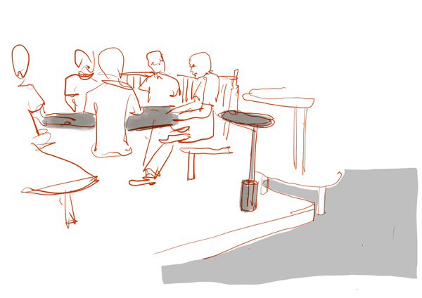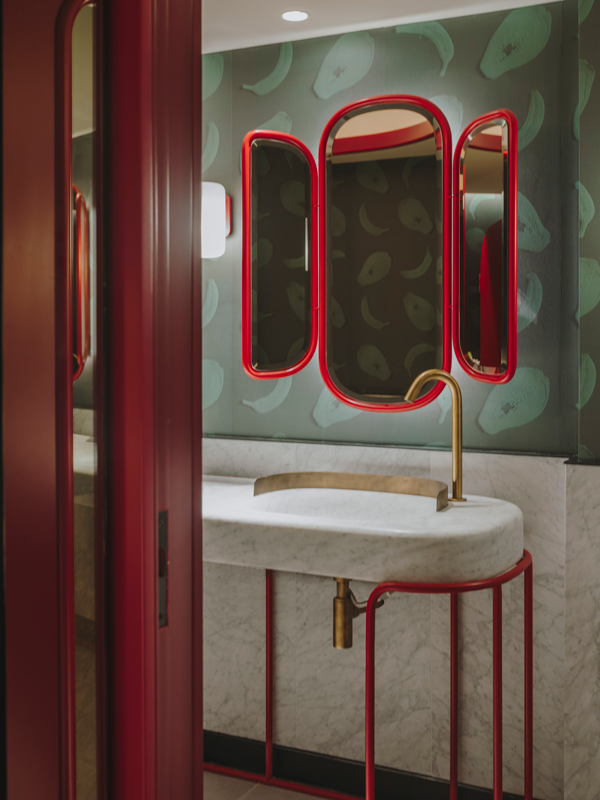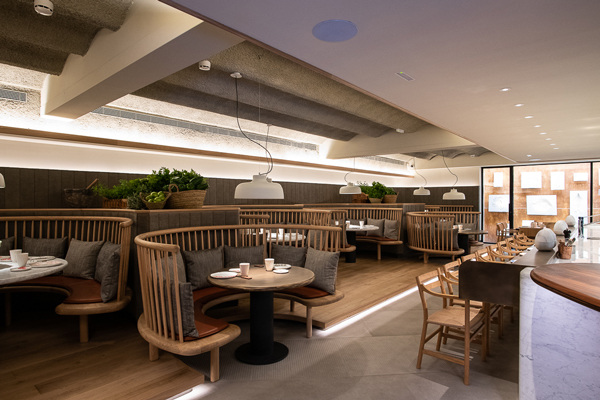 The evocative M68 lamps, with white shades, illuminate the round tables where diners are located, creating a warm and personal atmosphere. Designed in 1962 by Miguel Milá and re-edited in 1995 by Santa & Cole, the outline of the M68 immortalises the silhouette of a woman’s shoulders. The internal reflection of these opaque shades generates a diffuse light with a high colour rendering that enhances the beauty of the customers, the quality of materials and the texture of the dishes.