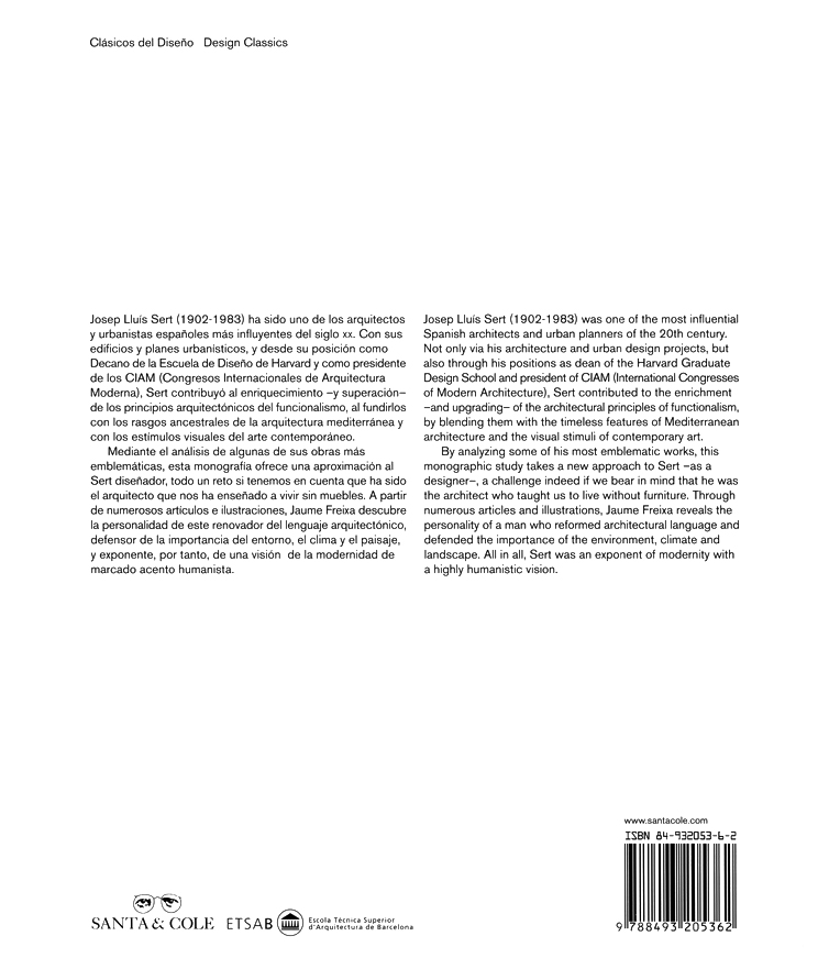 By analysing some of his most emblematic works, this monographic study takes a new approach to Sert -as a designer- a challenge indeed if we bear in mind that he was the architect who taught us to live without furniture. Through numerous articles and illustrations, Jaume Freixa reveals the personality of a man who reformed architectural language and defended the importance of the environment, climate and landscape. All in all, Sert was an exponent of modernity with a highly humanistic vision.