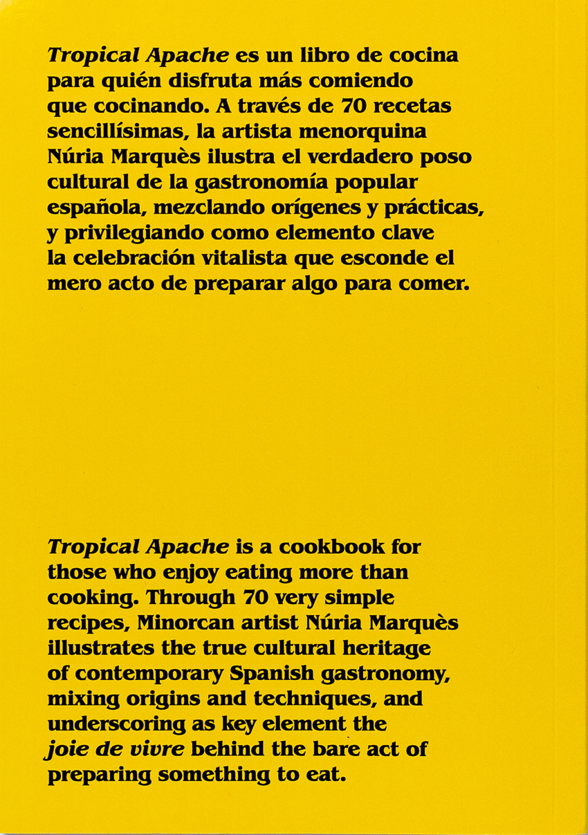 Tropical Apache is a cookbook for those who enjoy eating more than cooking. Through 70 very simple recipes, Minorcan artist Nuria Marqués illustrates the true cultural heritage of contemporary Spanish gastronomy, mixing origins and techniques, and underscoring as key element the joie de vivre behind the bare act of preparing something to eat.