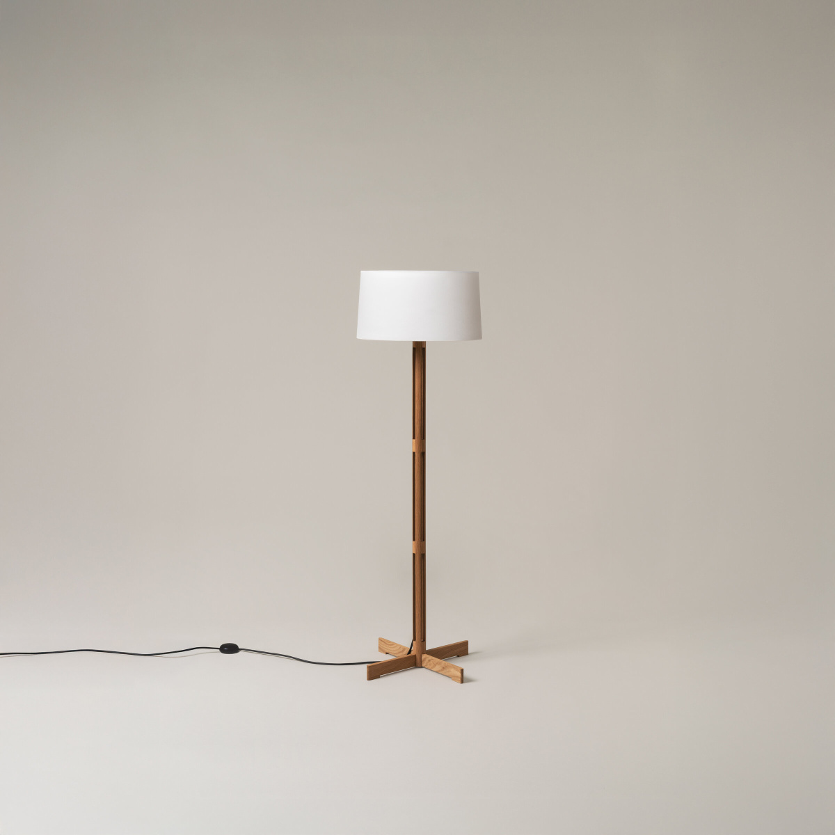 A cylindrical structure of solid oak, hollowed out longitudinally through a series of incisions. The characteristic cross-shaped intersection of the legs—a nod to other Miguel Milá classics—shares the same dimension as the lower circumference of the white parchment shade. Noble materials, pure forms, serene proportions. With no concessions to superfluous ornamentation, Miguel Milá achieved compositional harmony in this expression of industrial craftsmanship.