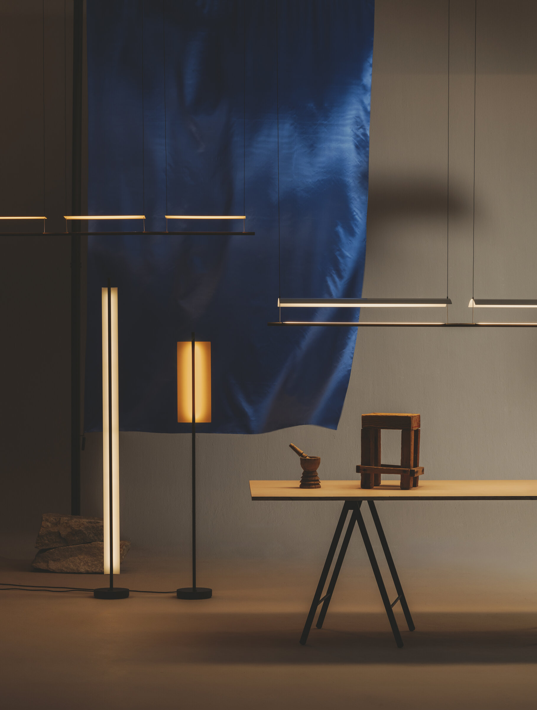 The Lámina family was born aloft as suspension lamps, with a lightness that knows how to be intelligent. Erected as luminous sculptures, they stand out against any backdrop behind them.