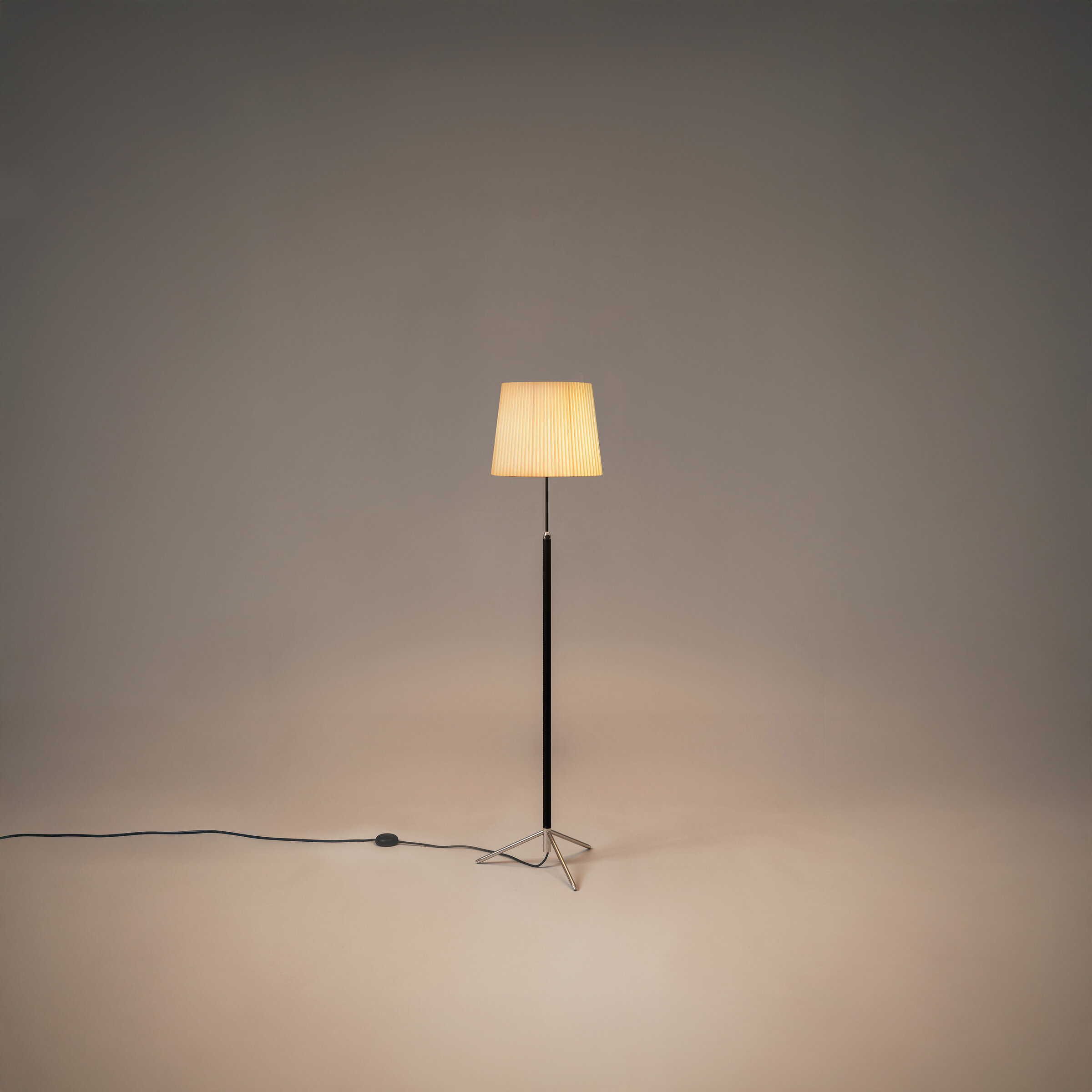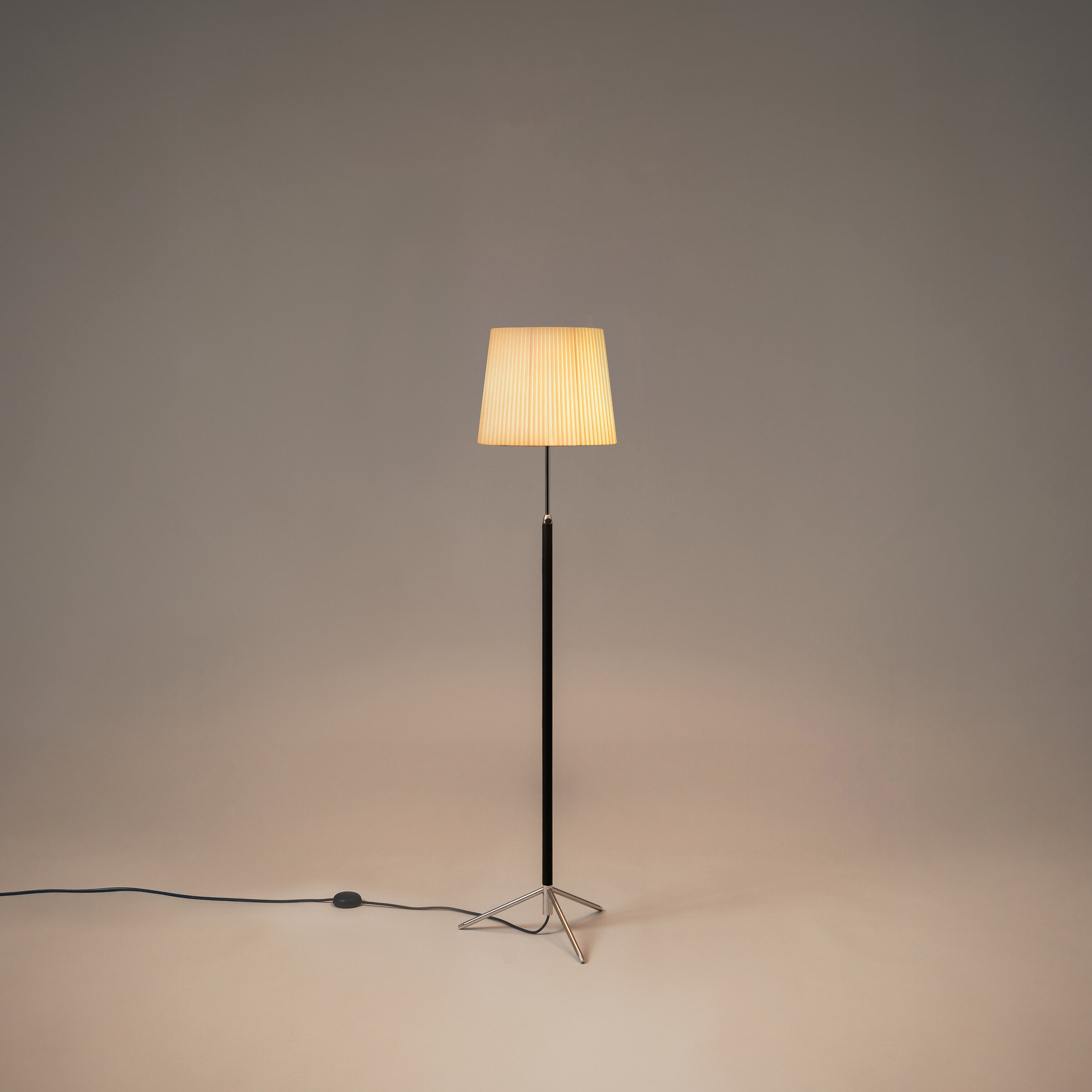 This slender reinterpretation of the traditional floor lamp embodies a timeless elegance conceived in a contemporary context. Its central shaft, wrapped in leather for a refined tactile feel, is height-adjustable at the top and rests on a simple tripod base that allows for easy cable exit. A perfect example of industrial craftsmanship, it accommodates shades in three different shapes, three material options, and five available colors.