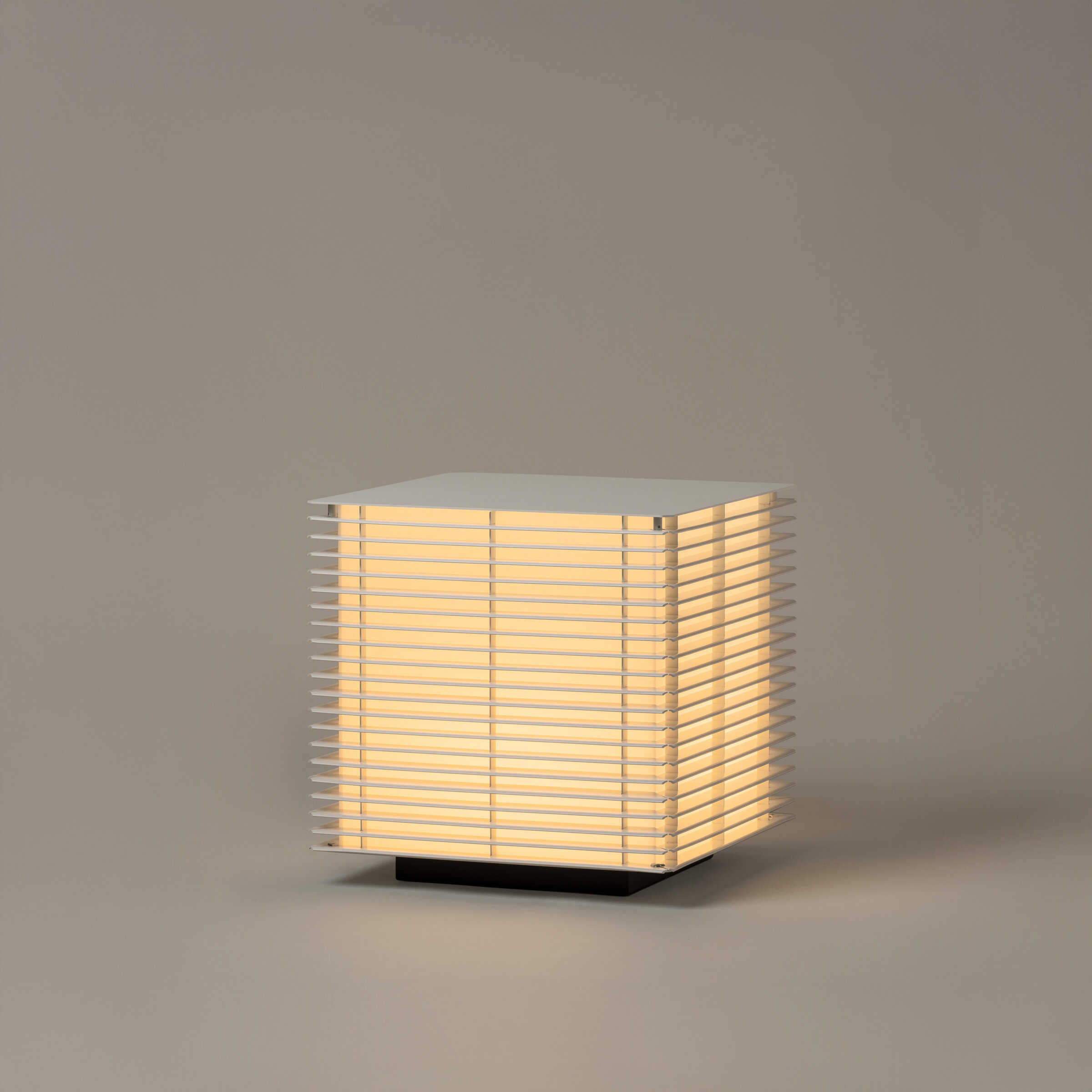 This outdoor lamp draws a dialogue between architecture and nature, integrating naturally into the landscape. Its rational, refined structure does not enclose but filters light through the slats arranged in a cubic form. The result is a soft, grazing illumination that creates a tranquil atmosphere, balancing the inhabited outdoor space with the open natural world.