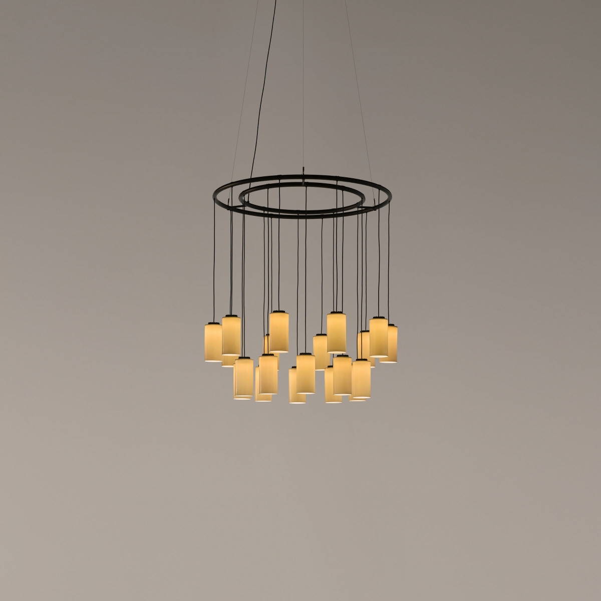 Cirio Chandelier concentrates a large amount of light into a vertical column that stands out against its surrounding space. Its compact sequence of concentric rings, increasing in diameter outward, can suspend twenty, thirty, or even forty points of light, collectively radiating a warm and striking luminous flow with strong visual impact.