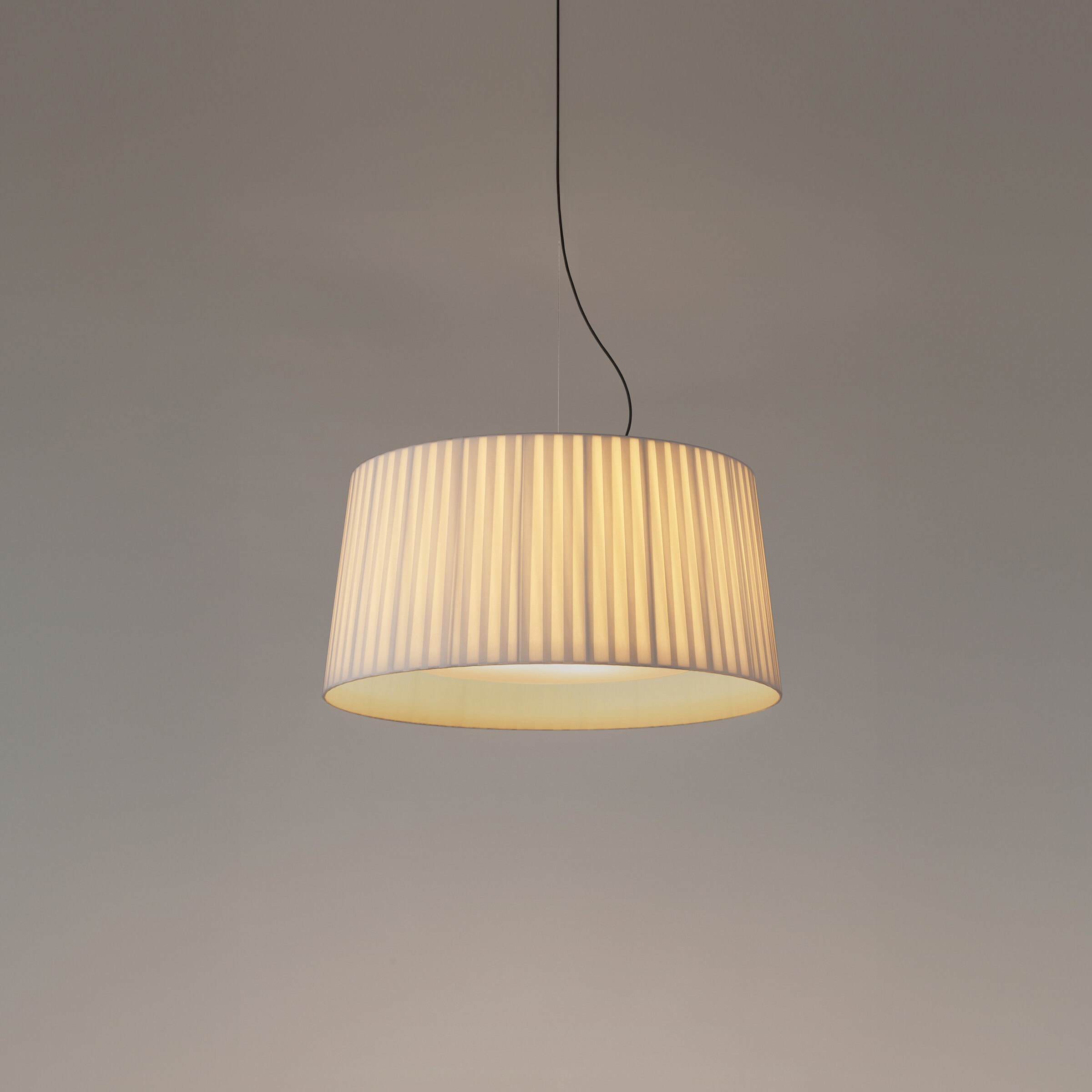 From large pendant lamps designed to grace the most demanding spaces to small table lamps for the bedside. This is a vibrant family of ribboned drum shades that knows how to shift scale without losing its essence.