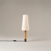 A birchwood cylinder, supported by a heavy metal base of the same diameter, finished in bronze or nickel, elevates a variety of shades in different shapes and colors, crafted from stitched parchment or ribbon. While the balance is already excellent, it can optionally be enhanced with a wider bottom base, designed for use in communal spaces.