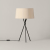 The name Trípode honors the bundle of three black metal rods that support a wide, fluted drum. When lit, it provides a warm light; when off, it becomes a volumetric sculpture. Trípode humanizes neutral spaces with the sober vibrancy of its shade, manually ribboned, turn by turn.
