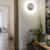 This metal disc, available in two sizes—Disco M and Disco L—reflects its light onto the wall, creating a halo around its opaque circle finished in satin nickel. Buttons of light in space.