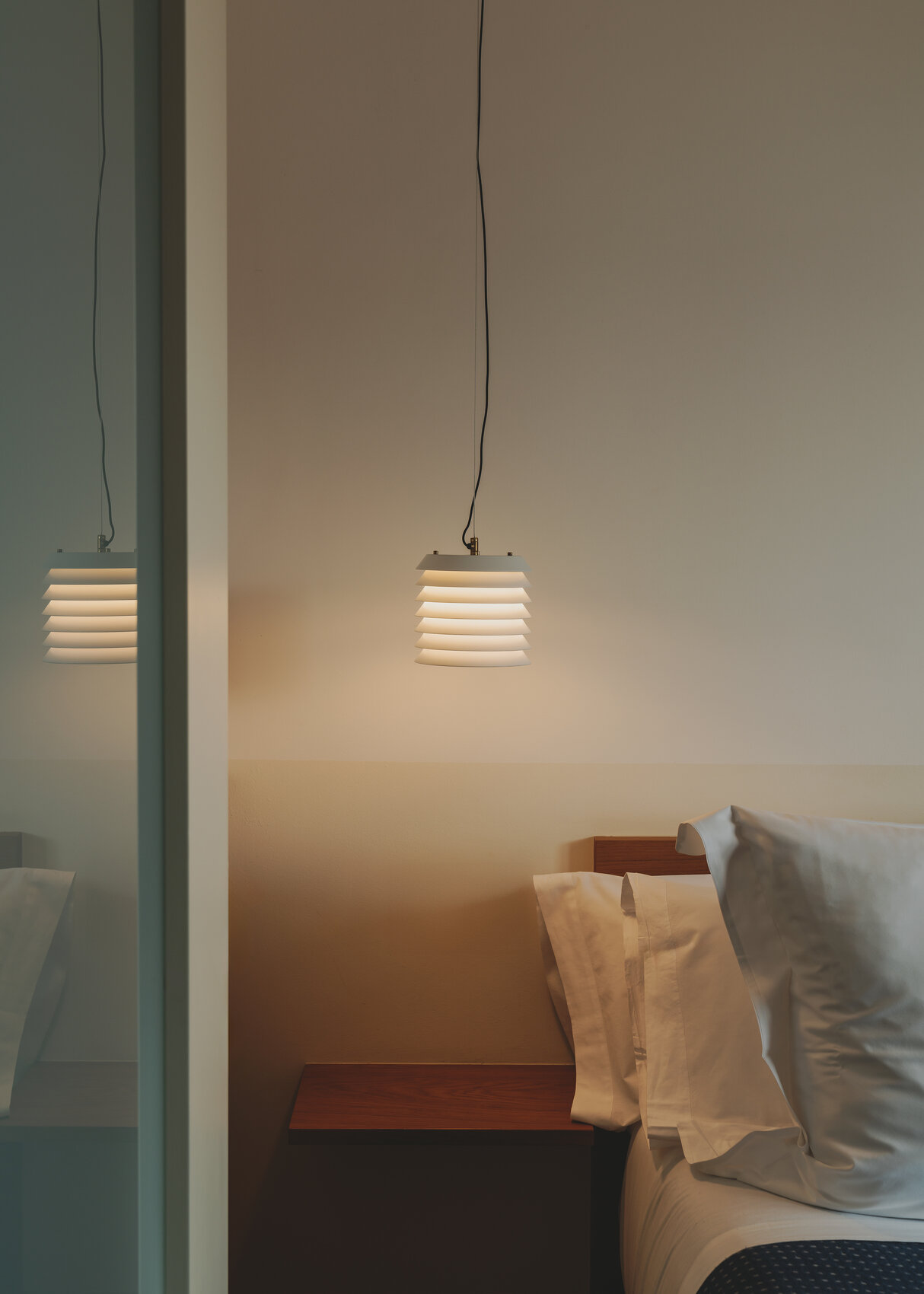 Metallic lampshade and circular canopy finished in matte white or satin nude rose (Maija 15).