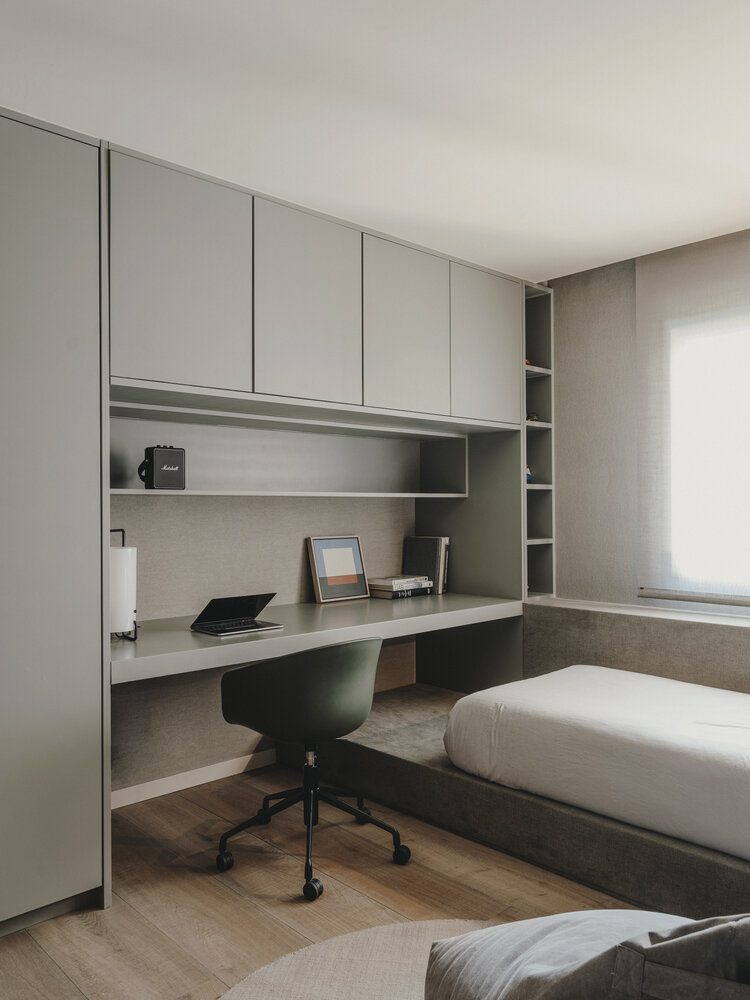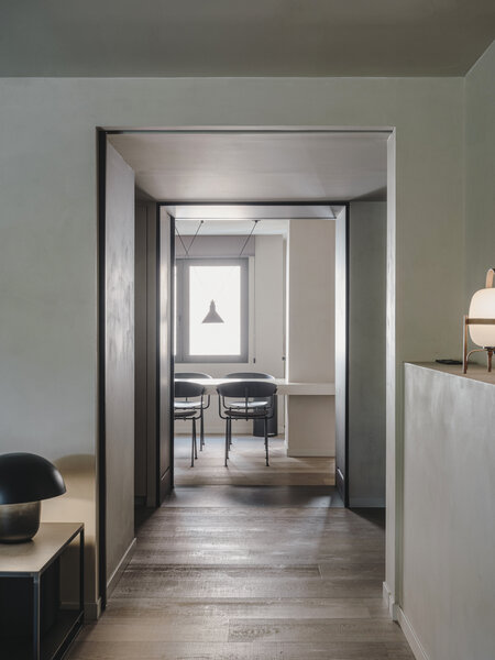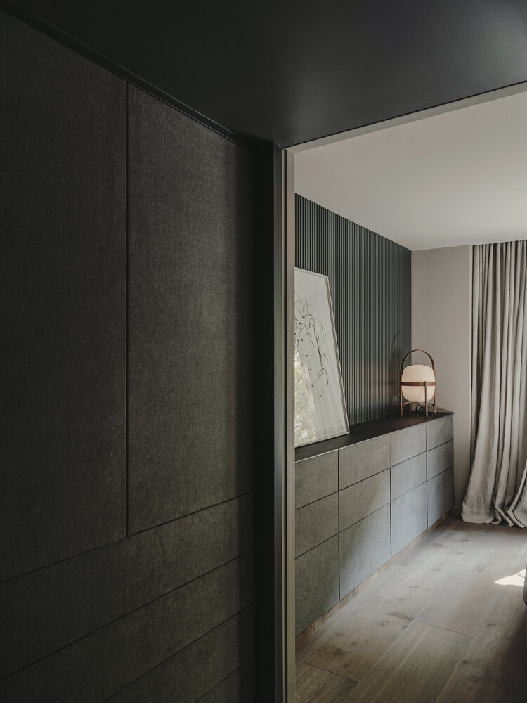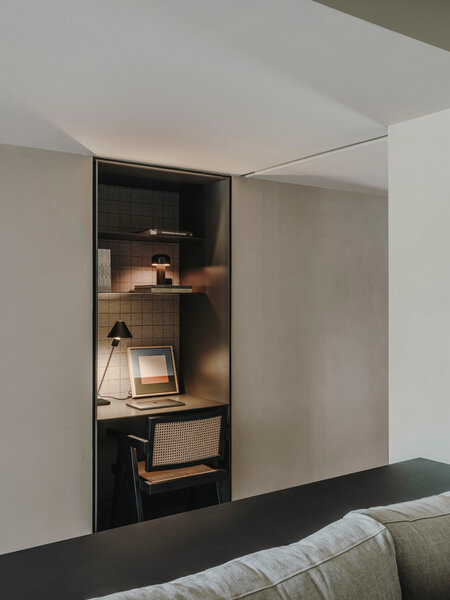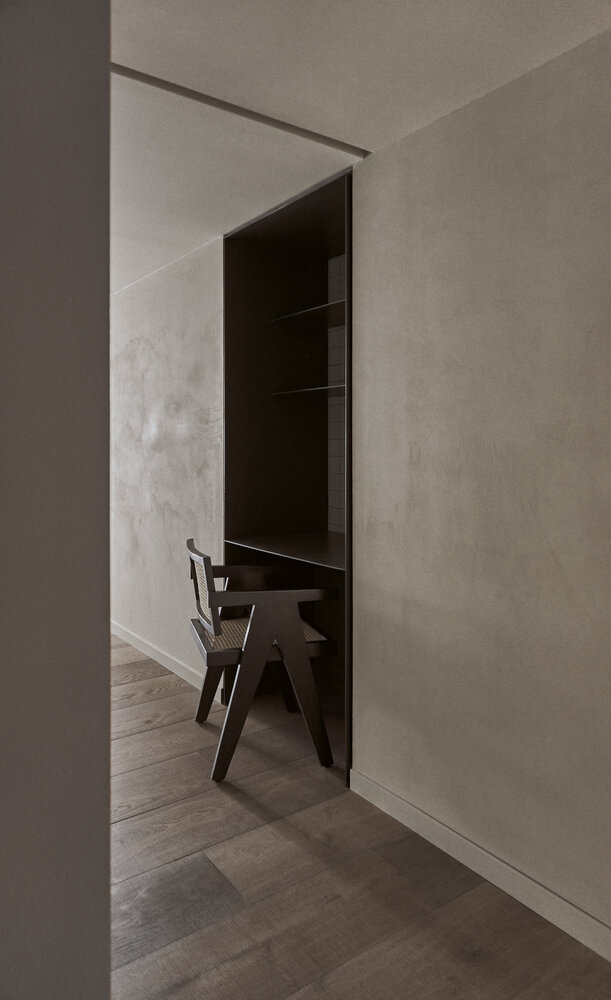 The rough microcement contrasts with the warmth of the upholstery and the irregularity of the natural wood. The chromatic purity builds a neutral and continuous enclosure, enhancing the sensations created by the textures on walls and floors. The conductive thread, bruno, appears in varying points and elements of the house and confers character to their environments.