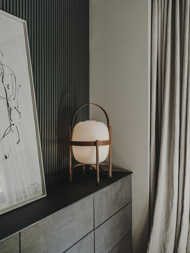 The set of Santa & Cole pieces illuminate with delicacy, inviting to gather in this new home. Suspended, over the dining table, the horizontal Tekiò lamp by Anthony Dickens participates in the play of hues, materials and textiles of the project. Dressed in Japanese Washi paper, it fuses ancient craftsmanship techniques with Warm to Dim LED technology to regulate the light in intensity and colour temperature.