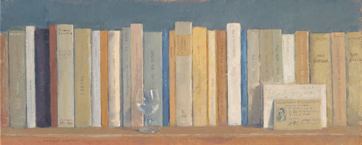 Libros y memoria es una serie de pinturas de Carmen Galofré que, a modo de naturaleza muerta, evoca bodegones de libros colmados de vida, citas y recuerdos. Con una paleta cálida y una pincelada sutil, la artista rinde homenaje al libro como objeto físico, refugio emocional y testigo silencioso del pensamiento y la memoria. Una celebración de la lectura como acto cotidiano, y una oda al libro como compañero.