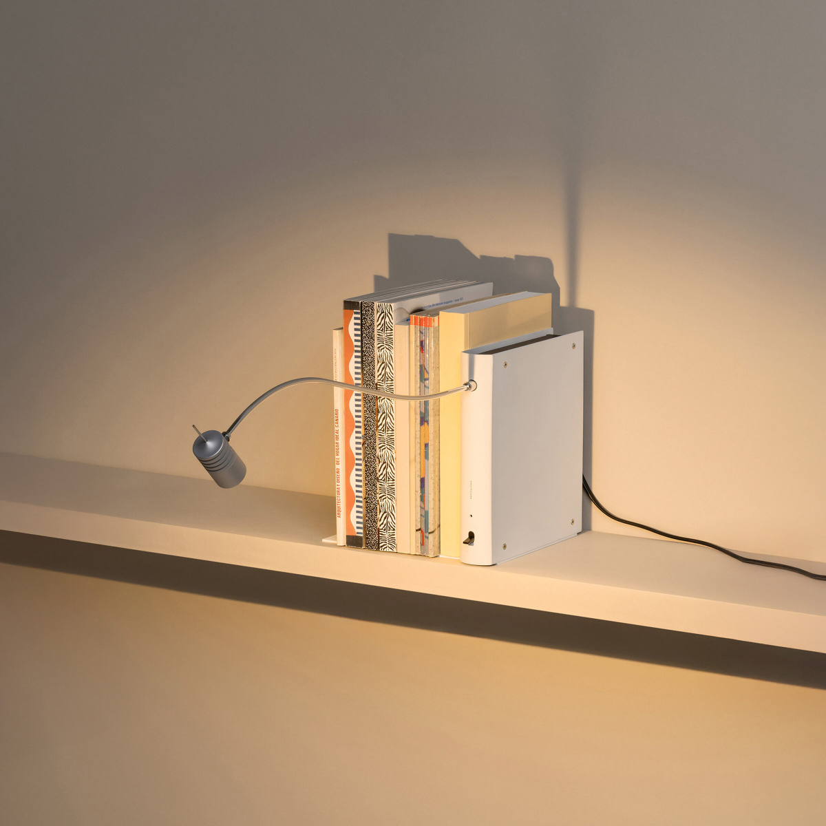 Bib Luz tiene un cuerpo metálico con forma de libro, en blanco o gris aluminio, para ser colocada en estanterías, entre verdaderos libros. De la parte superior del lomo se avanza un fino brazo con un punto de luz orientable en su extremo que permite resaltar todo rincón. Además, se pueden interconectar múltiples unidades en serie con un solo enchufe a la pared y crear composiciones a distintos niveles. Siempre con excelente resultado, no deslumbrante, para quién busca entre los libros.