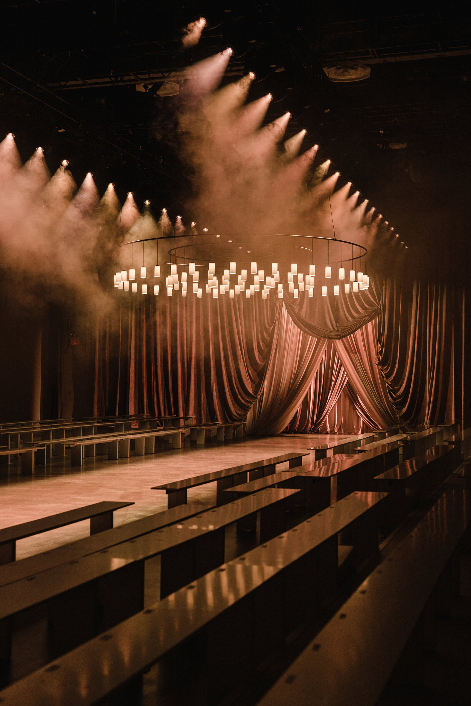 Desde tiempo antiguos, las mezquitas han utilizado grandes lámparas suspendidas en anillos concéntricos como símbolo de unidad y trascendencia. Estas estructuras flotantes crean una sensación de ingravidez y armonía en el espacio. Con efecto envolvente y solemne, Cirio es una reinterpretación de esa costumbre que busca elevar el espíritu.