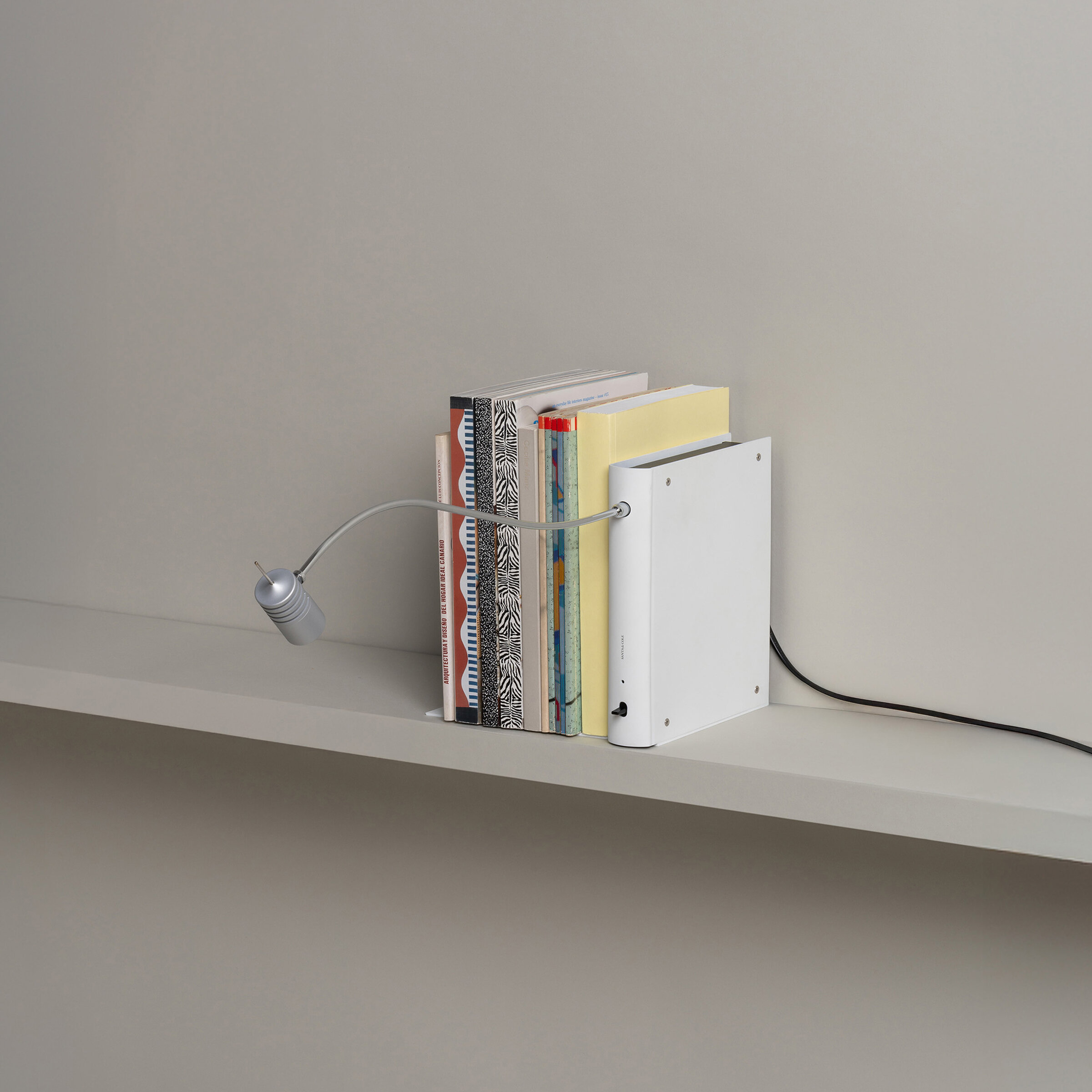 Bib Luz tiene un cuerpo metálico con forma de libro, en blanco o gris aluminio, para ser colocada en estanterías, entre verdaderos libros. De la parte superior del lomo se avanza un fino brazo con un punto de luz orientable en su extremo que permite resaltar todo rincón. Además, se pueden interconectar múltiples unidades en serie con un solo enchufe a la pared y crear composiciones a distintos niveles. Siempre con excelente resultado, no deslumbrante, para quién busca entre los libros.