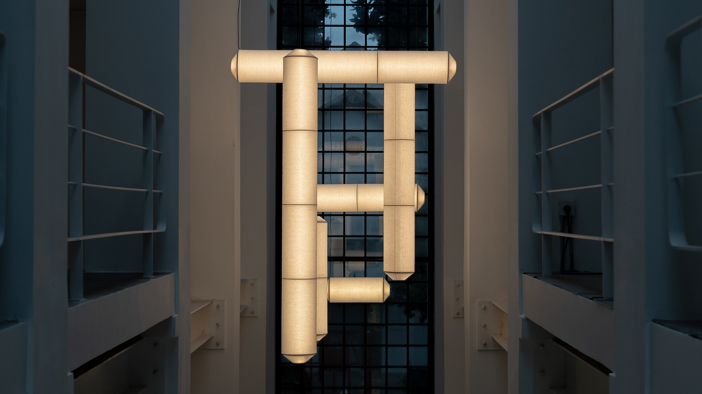 Una instalación lumínica de nuestra lámpara Tekiò posa sobre la exposición de mobiliario contemporáneo presentada por 101+ en el espacio Space101, en Hangzhou (China).