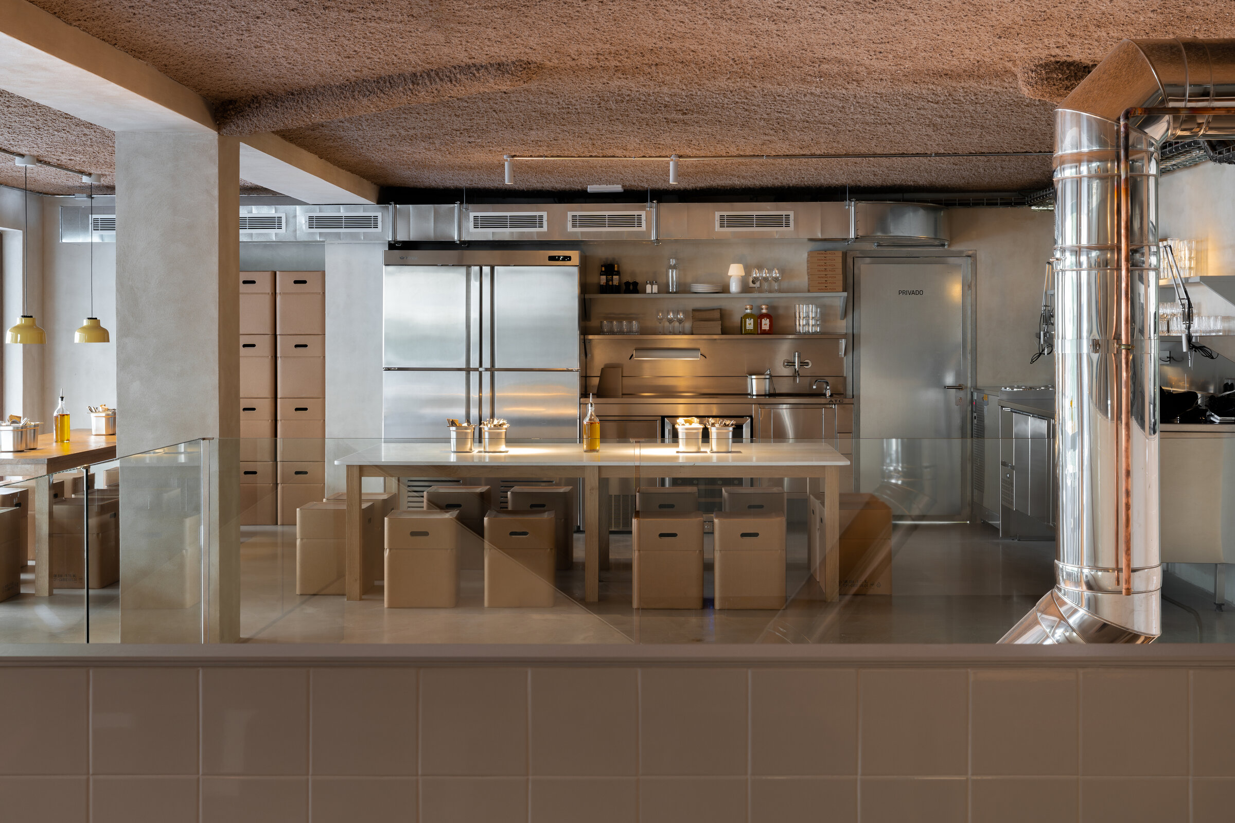 La funcionalidad sigue siendo un elemento clave en la conceptualización del establecimiento. Sus versátiles taburetes de cartón -gracias a su capacidad de almacenamiento-; las largas mesas de madera de roble; y la cocina integrada permiten que el producto se convierta en el verdadero protagonista.