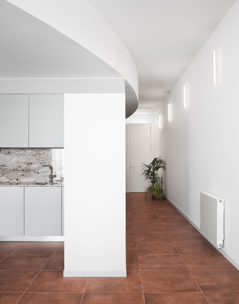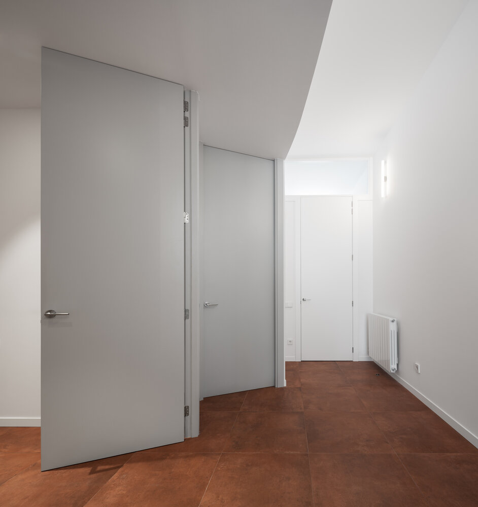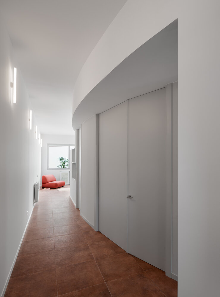 Tras el vestíbulo, un insólito pasillo en curva acompaña a cada estancia. Una zona de paso, habitualmente residual, reconvertida con ingenio. Se han diseñado puertas continuas de suelo a techo, originando un juego visual a lo largo del corredor. Al final del cual, un espacio diáfano integra cocina, comedor y salón. La intimidad de un patio de nueva creación impregna de claridad la parte posterior de la parcela.