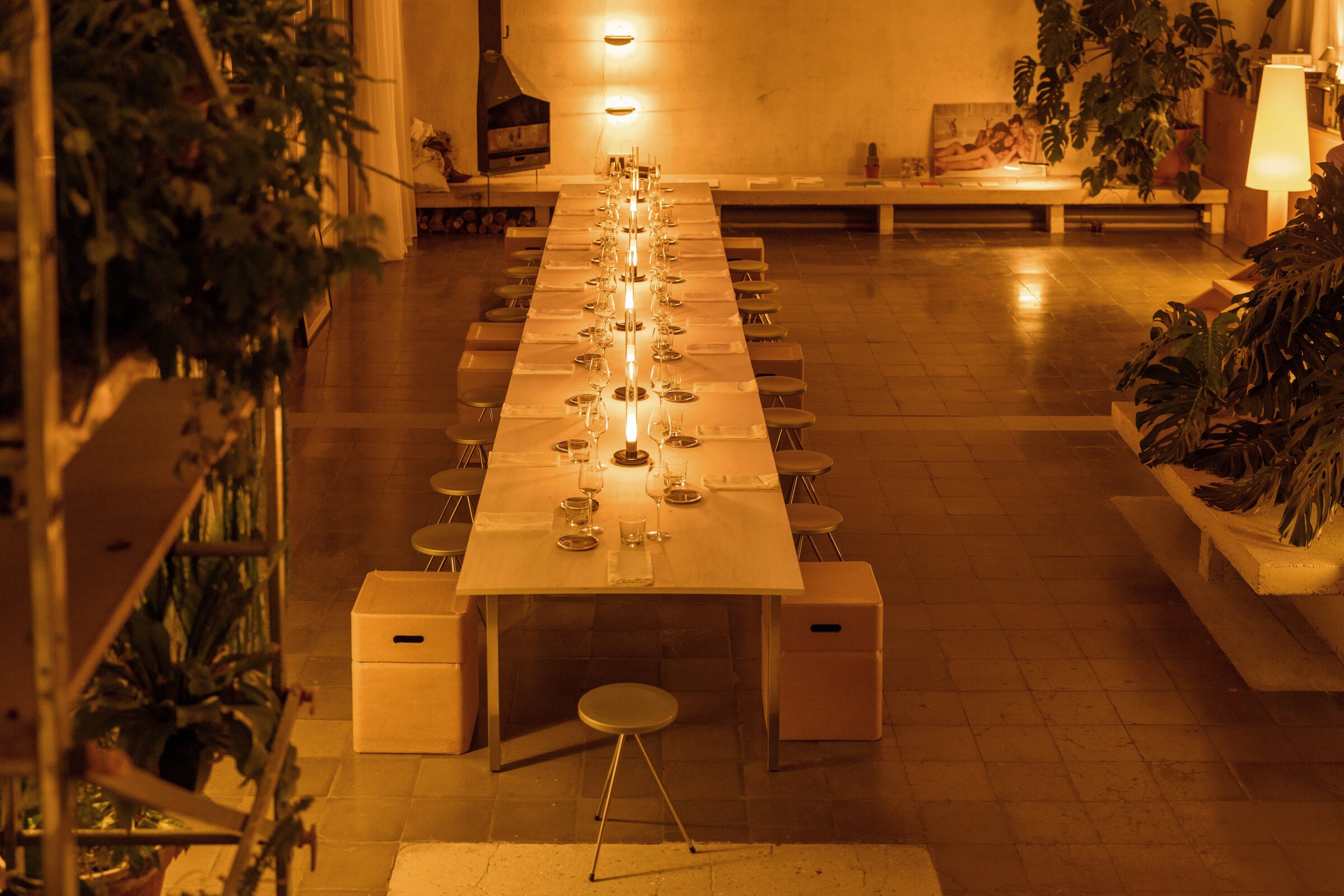 Subo hasta la cuarta planta a pie para no perderme nada (de lo que pueda suceder en la escalera). Durante el ascenso me parece oír una misa cantada. En este edificio cohabitan talleres, almacenes y varias iglesias de diferentes confesiones, pero de eso me enteraré más tarde. Estamos en Sant Adrià de Besòs, una ciudad (aún no gentrificada) en la periferia de Barcelona con un marcado pasado industrial. Aquí es donde el joven estudio de arquitectura Atienza Maure junto a Giagchico (Giulia Amos y Agustín Iglesias) y Abel Iglesias han creado La Nave, un antigua imprenta de 450 m2 que ha recibido el premio FAD de interiorismo 2025. Anoche, Santa & Cole junto a los arquitectos, el propietario y diseñadores y amigos de la casa, celebraron un encuentro muy especial en torno a la luz. Este lugar aparentemente duro y frío se caldeó con las suaves luces de la marca. Nos sostuvieron y acomodaron.